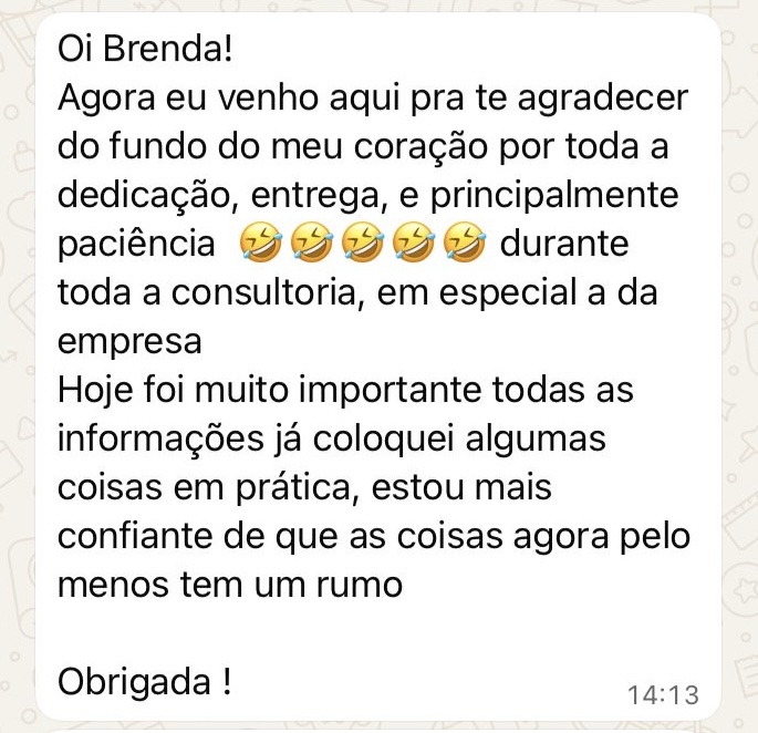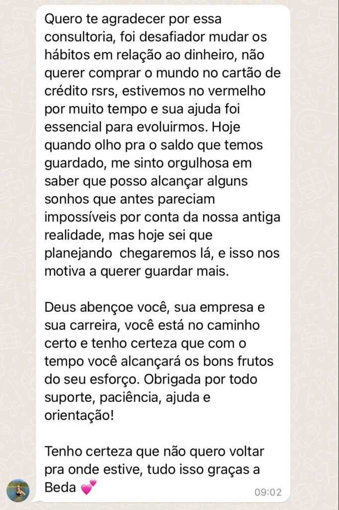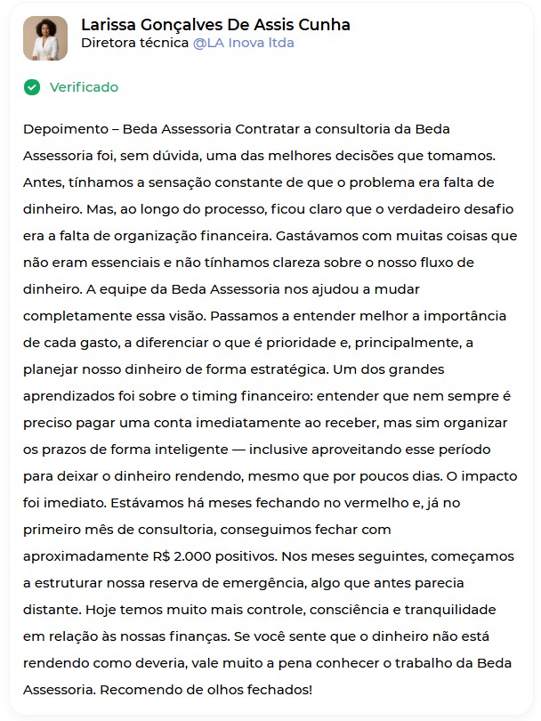 Reunião de 2 horas para apresentar o diagnóstico e orientações práticas para a nova gestão financeira mensal. Após a entrega, ficamos disponíveis por 15 dias para tirar dúvidas — de segunda a sexta, das 10h às 17h.